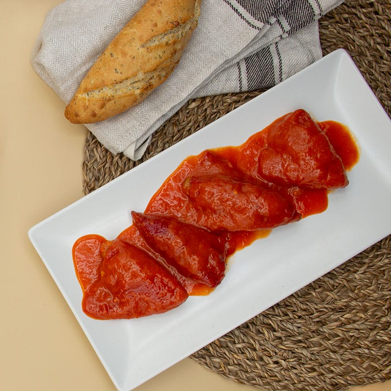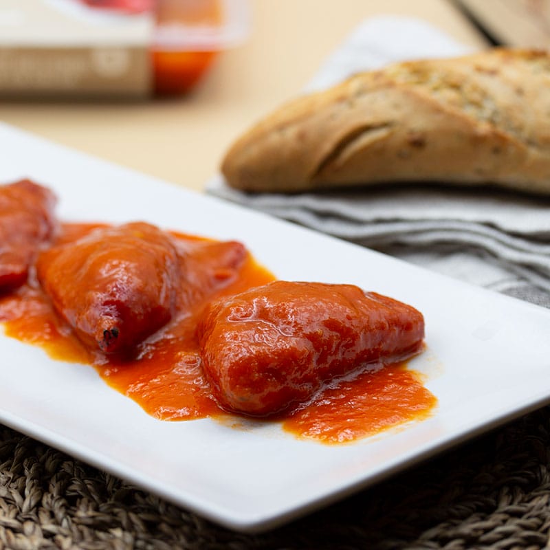 El Pimiento Relleno de Carne en Salsa es uno de los buques insignia de nuestra gastronomía. Los Pimientos del Piquillo vienen rellenos de carne, integrada en un deliciosa bechamel que hacemos con leche de caserío. La salsa que acompaña a nuestros Pimientos del Piquillo pide mucho pan, así que es es una opción perfecta como plato principal.¡ Llévalo a tu cesta y en nada los tienes en tu casa!